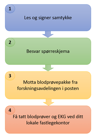Hvis du samtykker til deltakelse vil du bli sendt videre til et elektronisk spørreskjema. Det tar ca. 30 minutter å gjennomføre skjemaet. Skjemaet inneholder hovedsakelig spørsmål om din atrieflimmer, andre relaterte sykdommer, livsstil og livskvalitet. Opplysningene fra spørreskjemaet lagres på en sikker server ved Universitetet i Oslo.