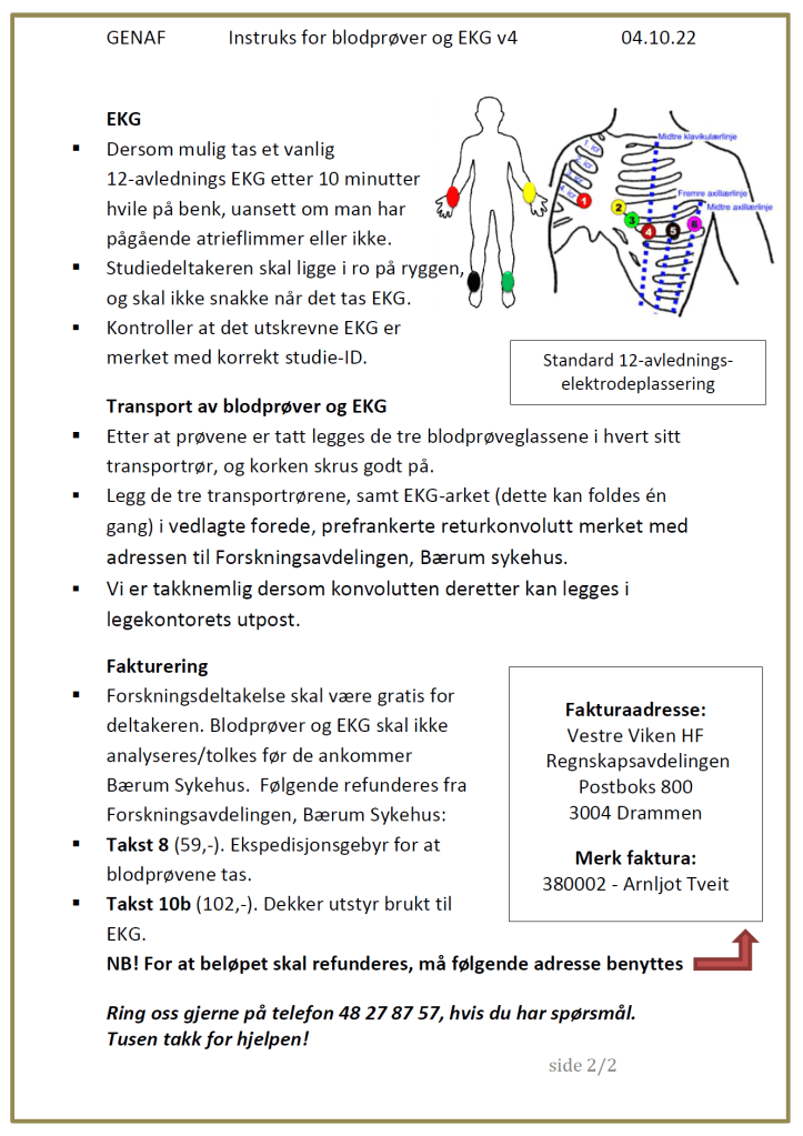 Konvolutteninneholder invitasjon til deltakelse i studien. Hvis pasienten velger å delta, vil hun/han gå inn på vår hjemmeside www.GENAF.no, hvor de kan lese om studien, og utfylle samtykkeerklæring og spørreskjema. Etter at samtykke er signert, vil deltakere få tilsendt et blodprøvetakingssett inkludert en detaljert «Instruks for blodprøvetaking og forsendelse». Hun/han bes avtale tid for å ta EKG og blodprøver ved fastlegekontoret.